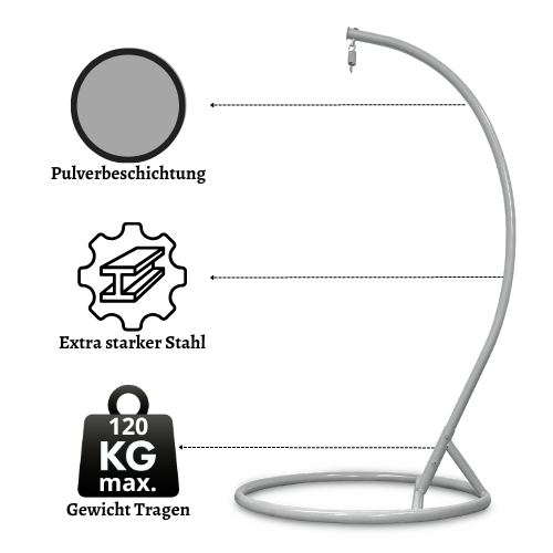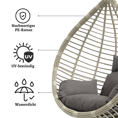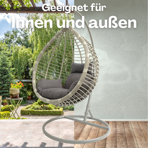 Der Hängesessel hat ein schönes und exklusives Rattan-Design. Dieser Stil sorgt dafür, dass es nicht nur Sie, sondern auch alle Ihre Gäste anspricht. Zudem ist der Hängesessel durch sein rundes Stahlgestell sehr robust und sehr stabil. Es kann ein Gewicht von 120 kg tragen.