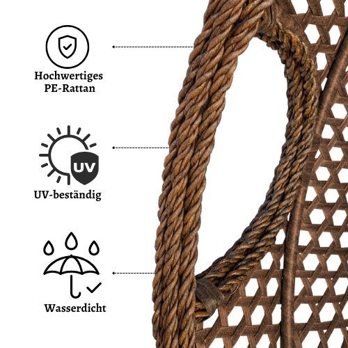 Der Hängesessel hat ein schönes und exklusives Rattan-Design. Dieser Stil sorgt dafür, dass es nicht nur Sie, sondern auch alle Ihre Gäste anspricht. Zudem ist der Hängesessel durch sein rundes Stahlgestell sehr robust und sehr stabil. Es kann ein Gewicht von 120 kg tragen.